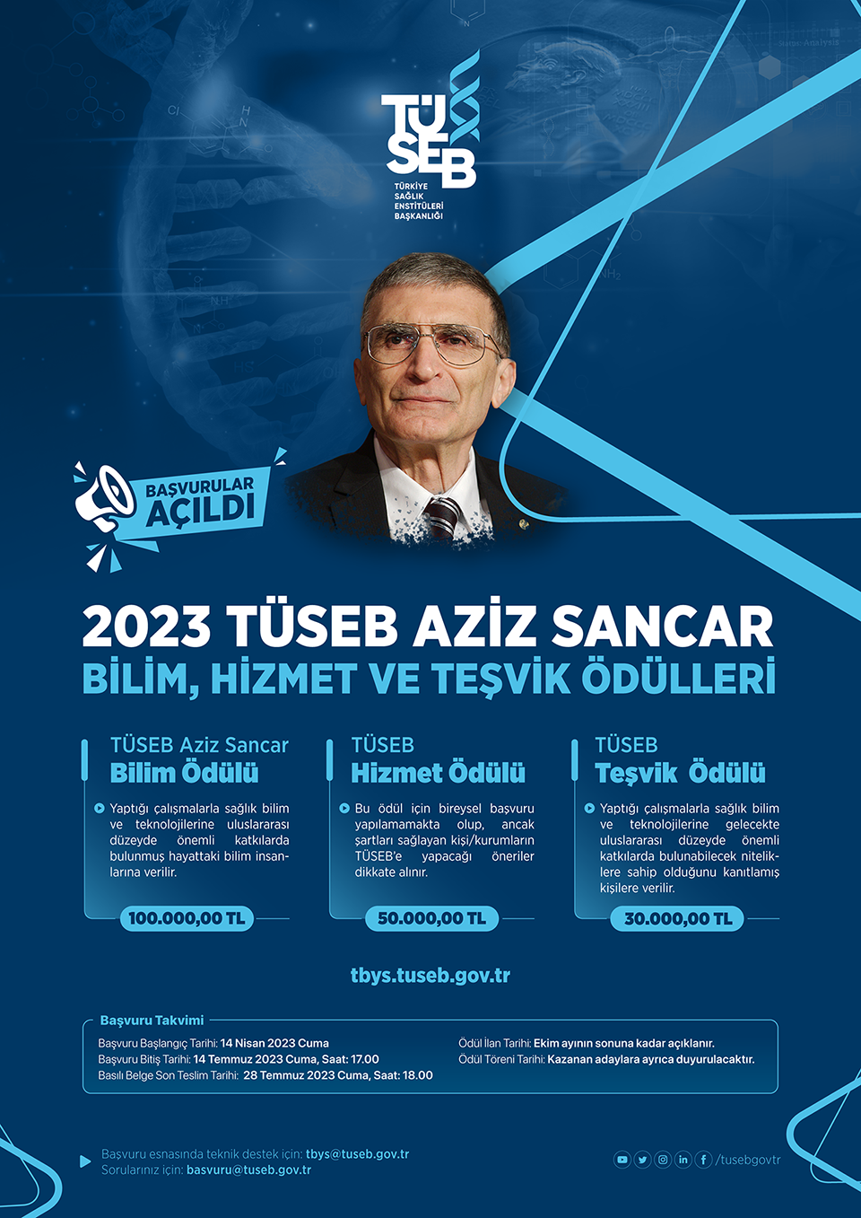 Türkiye Sağlık Enstitüleri Başkanlığı tarafından her yıl sağlık bilimi ve teknolojileri alanında ülkeye ve insanlığa hizmet etmek amacıyla; yaptığı çalışmalarla bilime uluslararası düzeyde önemli katkılar sağlamış bilim insanlarımıza verilen TÜSEB Aziz Sancar Bilim, Hizmet ve Teşvik Ödülleri 2023 yılı başvuruları açılmıştır. Başvuru sistemi 3 ay açık kalacak olup, Son başvuru tarihi: 14 Temmuz 2023 Cuma saat 17:00'dir.