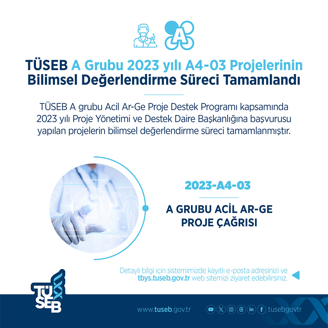 TÜSEB A grubu Acil Ar-Ge Proje Destek Programı kapsamında 2023 yılı Proje Yönetimi ve Destek Daire Başkanlığı’na başvurusu yapılan projelerin bilimsel değerlendirme süreci tamamlanmıştır.