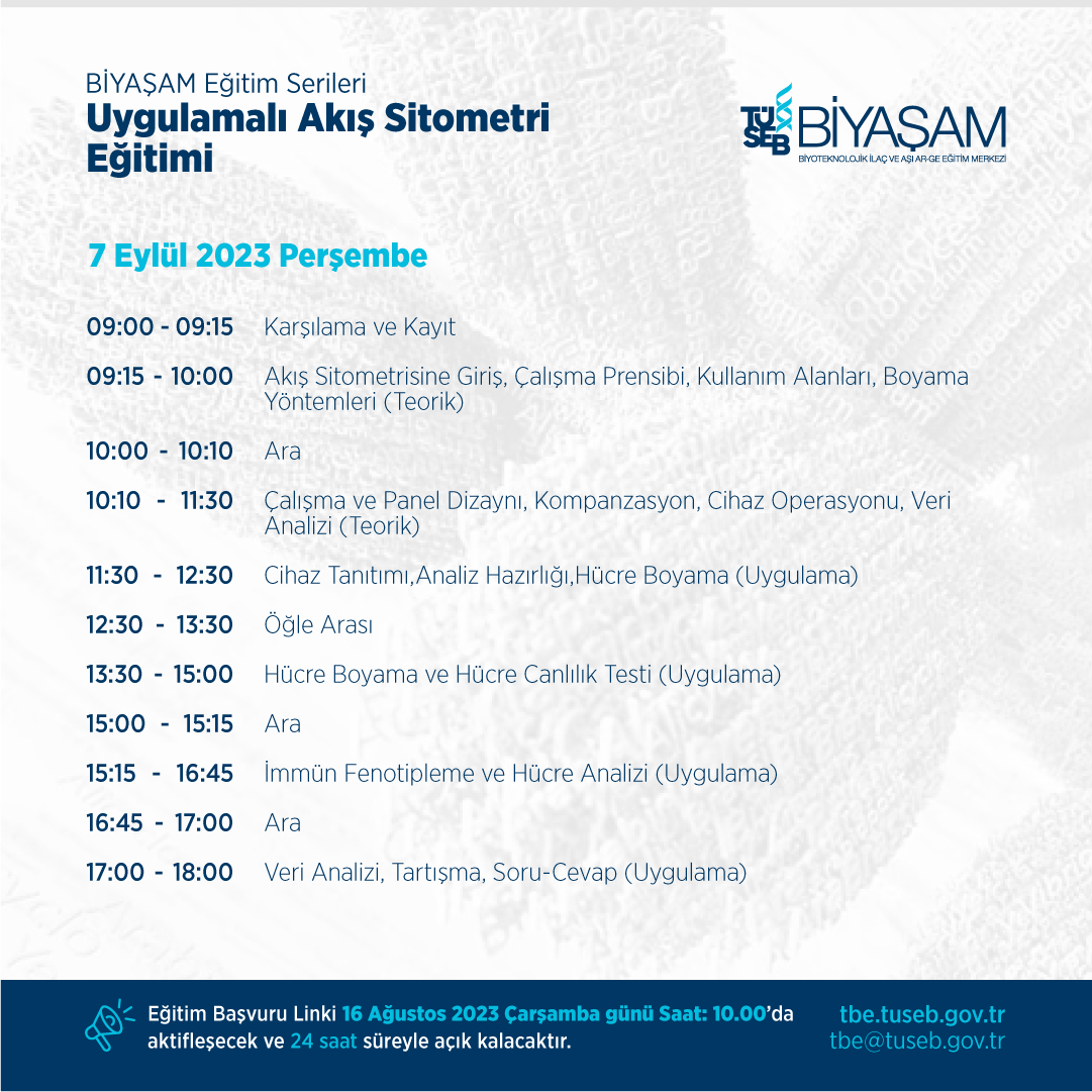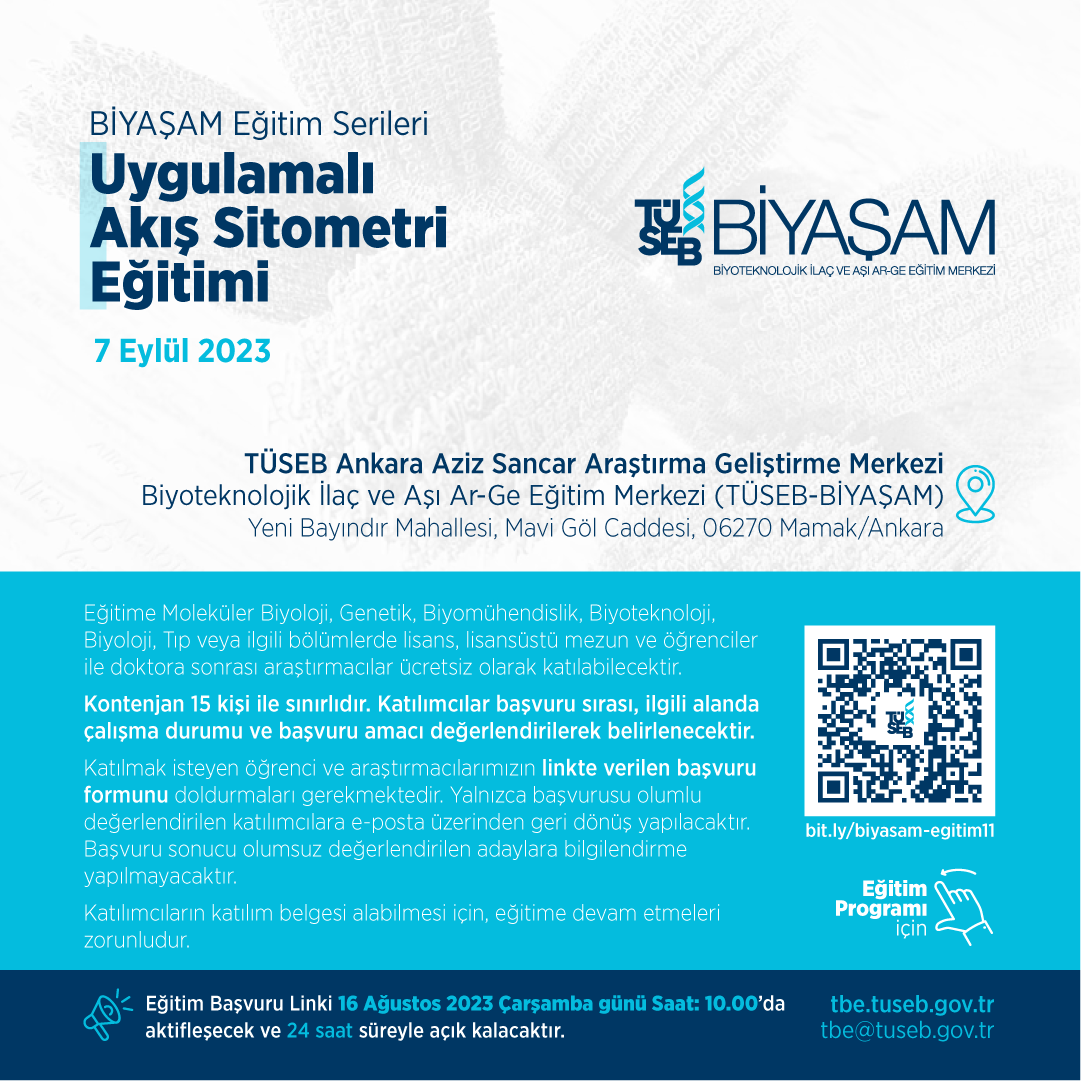 TÜSEB Türkiye Biyoteknoloji Enstitüsü tarafından ‘Uygulamalı Akış Sitometri Eğitimi’ düzenlenecektir. Eğitim 7 Eylül 2023 tarihinde TÜSEB Ankara Aziz Sancar Araştırma Geliştirme Merkezi bünyesinde bulunan Biyoteknolojik İlaç ve Aşı Ar-Ge Eğitim Merkezi’nde (TÜSEB-BİYAŞAM) gerçekleştirilecektir.