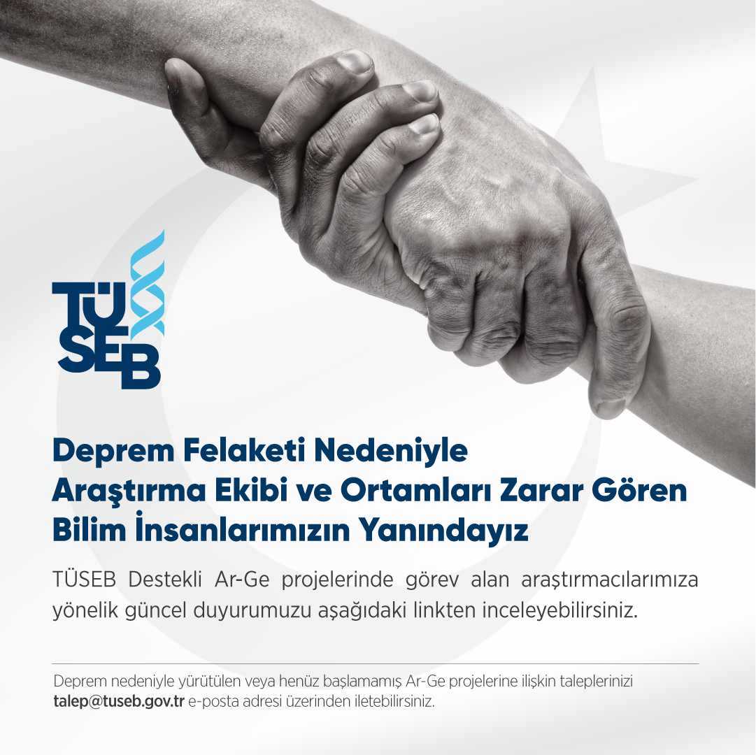Deprem nedeniyle yürütülen veya henüz başlamamış Ar-Ge projelerine ilişkin taleplerinizi talep@tuseb.gov.tr e-posta adresi üzerinden iletebilirsiniz.