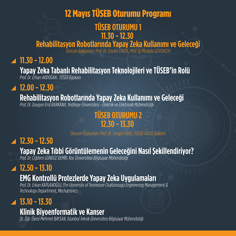 Kongre kapsamında TÜSEB tarafından, sağlık ekosisteminin önemli bir parçası haline gelen yapay zekâ ile ilgili iki oturum düzenlenecek. İlk oturumda “Yapay Zekâ Tabanlı Rehabilitasyon Teknolojileri ve TÜSEB’in Rolü”, “Rehabilitasyon Robotlarında Yapay Zekâ Kullanımı ve Geleceği” sunumları, ikinci oturumda ise “Yapay Zeka Tıbbi Görüntülemenin Geleceğini Nasıl Şekillendiriyor?”, “EMG Kontrollü Protezlerde Yapay Zeka Uygulamaları”, “Klinik Biyoenformatik ve Kanser” sunumları yer alacak.