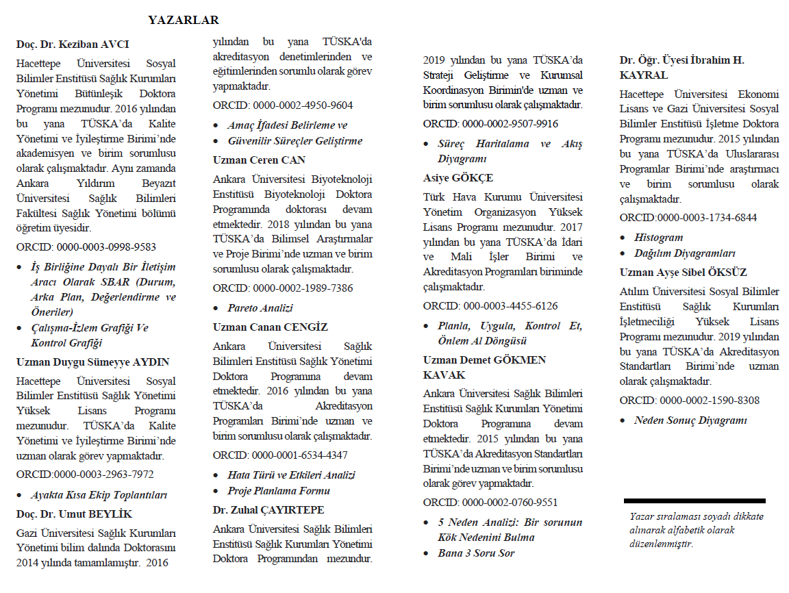Bu kapsamda Kalite Yönetimi ve İyileştirme Birimi tarafından hazırlanan ve büyük bir emeğin ürünü olan bu kitabın ortaya çıkmasında, bir ekip anlayışı içerisinde çalışmalarını hazırlayan TÜSKA çalışanlarına teşekkür ediyor, kitabın yönetim, tıp ve sağlık bilimleri öğrencilerine, sağlık çalışanlarına, yöneticilere ve akademisyenlere faydalı olmasını diliyoruz.