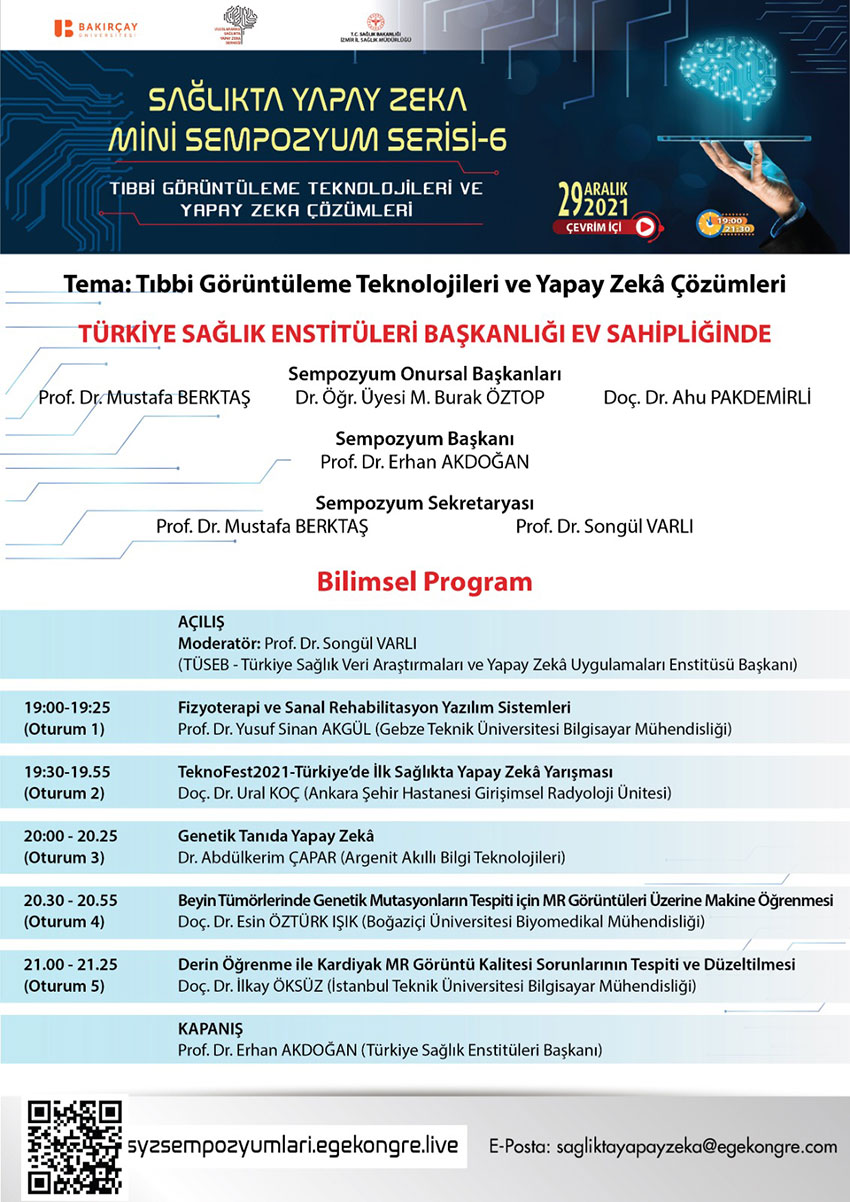 TÜSEB’ in de sağlık bilimi ve teknolojilerinin geliştirilmesinde yapay zeka uygulamalarının önemi nedeni ile destek verdiği ve çevrim içi olarak gerçekleştirilecek sempozyumda Türkiye Sağlık Veri Araştırmaları ve Yapay Zeka Uygulamaları Enstitüsü (TÜYZE) Başkanı Prof. Dr. Songül Varlı’nın moderatörlüğünde; Türkiye Gebze Teknik Üniversitesinden Prof. Dr. Yusuf Sinan Akgül “Fizyoterapi ve Sanal Rehabilitasyon Yazılım Sistemleri”, Ankara Şehir Hastanesinden Doç. Dr. Ural Koç “TeknoFest2021- Türkiye’de İlk Sağlıkta Yapay Zeka Yarışması” , Argenit Akıllı Bilgi Teknolojilerinden Dr. Abdülkerim Çapar “Genetik Tanıda Yapay Zeka”, Boğaziçi Üniversitesinden Doç. Dr. Esin Öztürk Işık “Beyin Tümörlerinde Genetik Mutasyonların Tespiti için MR Görüntüleri Üzerine Makine Öğrenmesi” , İstanbul Teknik Üniversitesinden Doç. Dr. İlkay Öksüz “Derin Öğrenme ile Kardiyak MR Görüntü Kalitesi Sorunlarının Tespiti ve Düzeltilmesi ” başlıklı konuşması ile bilgi ve deneyimlerini anlatacak.