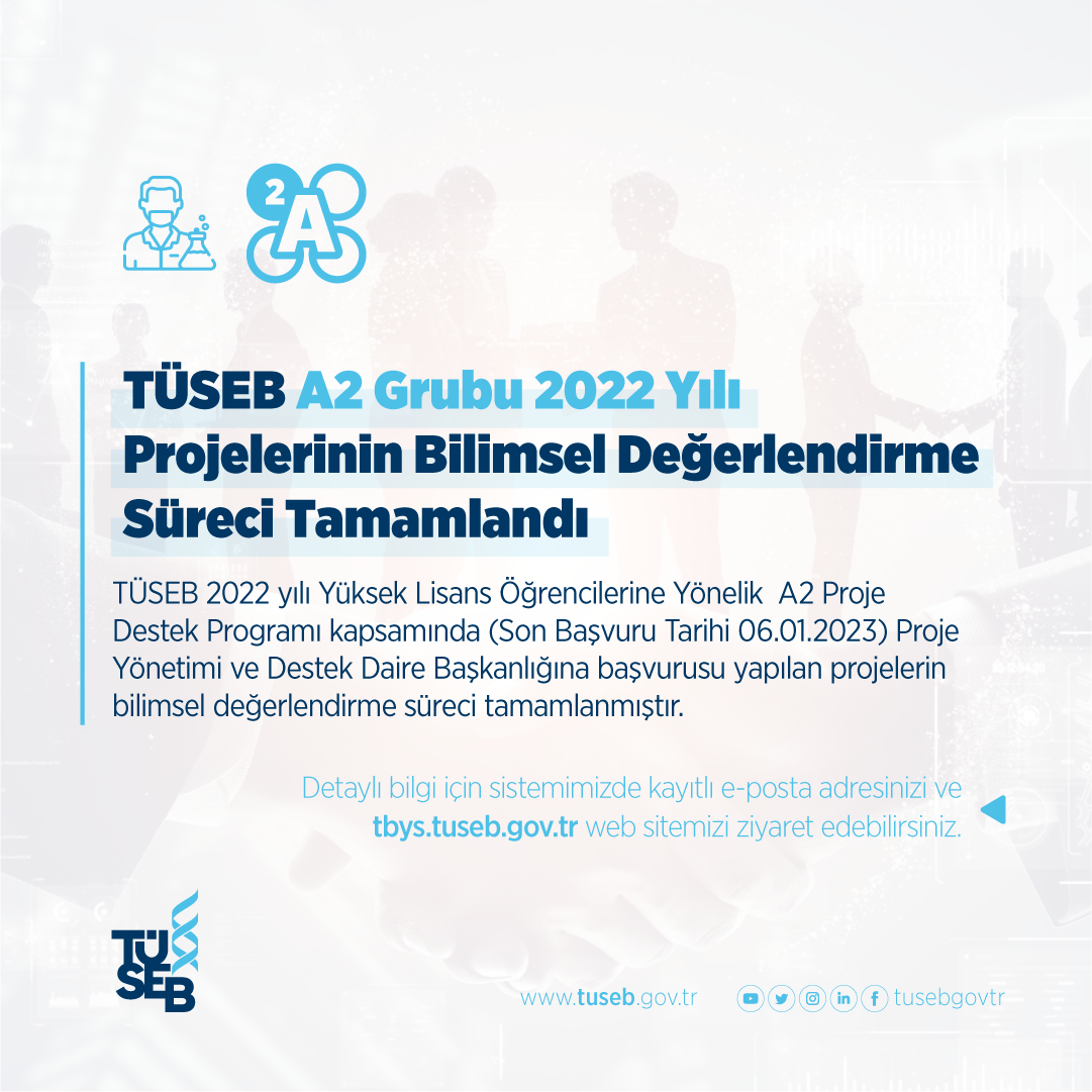 TÜSEB 2022 yılı Yüksek Lisans Öğrencilerine Yönelik A2 Proje Destek Programı kapsamında (Son Başvuru Tarihi 06.01.2023) Proje Yönetimi ve Destek Daire Başkanlığı’na başvurusu yapılan projelerin bilimsel değerlendirme süreci tamamlanmıştır.