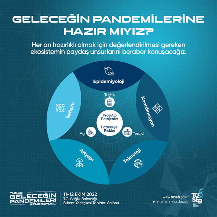 COVID-19 pandemisi sürecinde kazanılan tecrübe ile gelecekte ortaya çıkabilecek pandemiler için ülkemizin yol haritasının belirlenmesi, kapsamlı değerlendirmelerin yapılması, koordinasyonun sağlanması ve stratejilerin belirlenmesi amacıyla ekosistemin tüm paydaşlarının bir araya getirilmesi gelecekte ülkemizin karşılaşacağı sorunlara çözüm önerilerinin oluşturulması açısından güvence teşkil edecektir. Bu kapsamda, epidemiyoloji, koordinasyon, altyapı, teknoloji ve iletişim alanlarındaki çalışma ve gelişmelerin, teşhis, tedavi ve aşı çalışmalarındaki dönüşümlerin, prototip patojenler ve potansiyel risklerin ortaya konulması önem taşımaktadır. Bahse konu durum kapsamında sağlık ekosisteminin öncü kuruluşu TÜSEB tarafından, insanlığın ortak geleceğine katkı sunmak amacıyla 11-12 Ekim 2022 tarihlerinde T.C. Sağlık Bakanlığı Bilkent Yerleşkesi toplantı salonunda "TÜSEB GELECEĞİN PANDEMİLERİ SEMPOZYUMU" düzenlenecektir. T.C. Sağlık Bakanı Sayın Dr. Fahrettin KOCA'nın katılımları ve açılış konuşmaları ile başlayacak olan sempozyumda COVID-19 pandemisinde kazandığımız tecrübeler ile gelecek pandemilere dair yol haritamızı birlikte değerlendireceğiz.