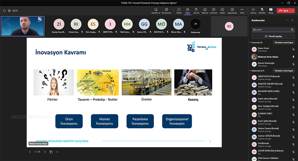 Bu doğrultuda TÜSEB Teknoloji Transfer Ofisi tarafından “TÜSEB Sağlıkta Teknoloji Dönüşümü Eğitim Serileri” düzenlenmektedir. Bu eğitimlerden ilki olan “Sağlıkta İnovasyon ve İnovatif Ürün Geliştirme Eğitimi” 24 Nisan 2023’te yapılmıştı. Serinin ikinci eğitimi olan “İnovatif Ürünlerde Prototip Geliştirme Eğitimi” TÜSEB TTO Araştırmacısı Dr. Öğr. Üyesi Mehmet Emin AKTAN tarafından 8 Mayıs 2023 Pazartesi günü gerçekleştirildi. Sağlık profesyonellerinin, sağlık alanında çalışan mühendislerin ve alana ilgi duyan öğrencilerin yoğun katılım gösterdiği eğitimde inovatif ürün geliştirme sürecinin fikirden ürüne tüm aşamaları hakkında bilgiler verildi. Her bir aşamanın özellikleri ve karşılaşılabilecek zorluklar değerlendirildi. Örnek olarak; bir rehabilitasyon robotunun fikirden prototip aşamasına gelene kadar geçirdiği süreçler hakkında bilgilendirme yapıldı.
