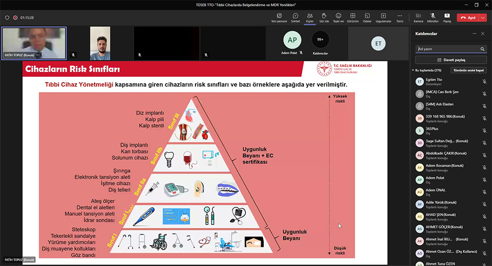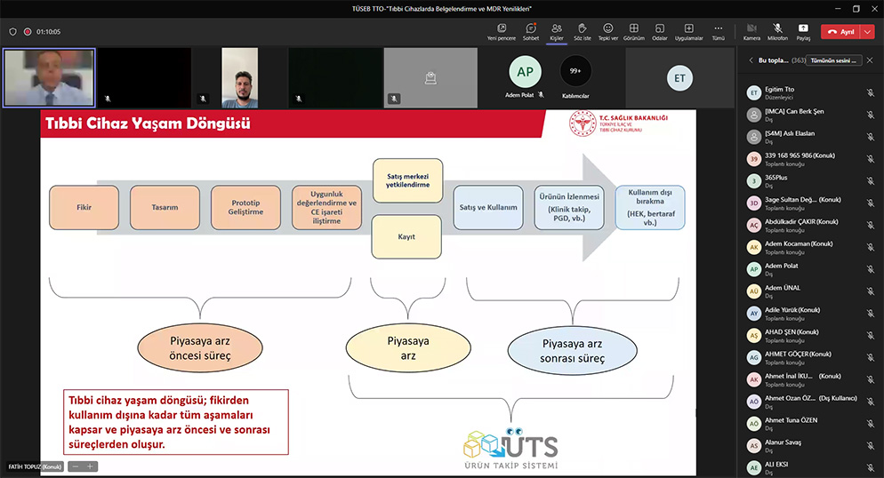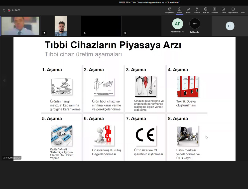 TÜSEB TTO tarafından düzenlenen Sağlıkta Teknoloji Dönüşümü Eğitim Serileri kapsamında çevrimiçi eğitimlerin dokuzuncusu olan “Tıbbi Cihazlarda Belgelendirme ve MDR Yenilikleri Eğitimi” Türkiye İlaç ve Tıbbi Cihaz Kurumu, Tıbbi Cihaz Onaylanmış Kuruluş ve Klinik Araştırmalar Dairesi Başkanı Fatih TOPUZ tarafından gerçekleştirildi.