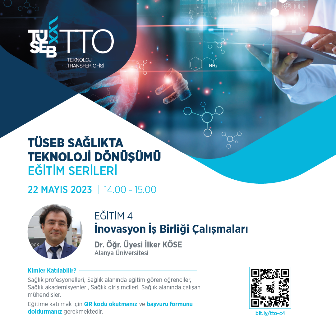 Bu doğrultuda, TÜSEB Teknoloji Transfer Ofisi tarafından çevrimiçi eğitimlerin dördüncüsü olan “İnovasyon İş Birliği Çalışmaları Eğitimi” 22 Mayıs Pazartesi günü saat 14:00’te çevrimiçi olarak gerçekleştirilecektir.