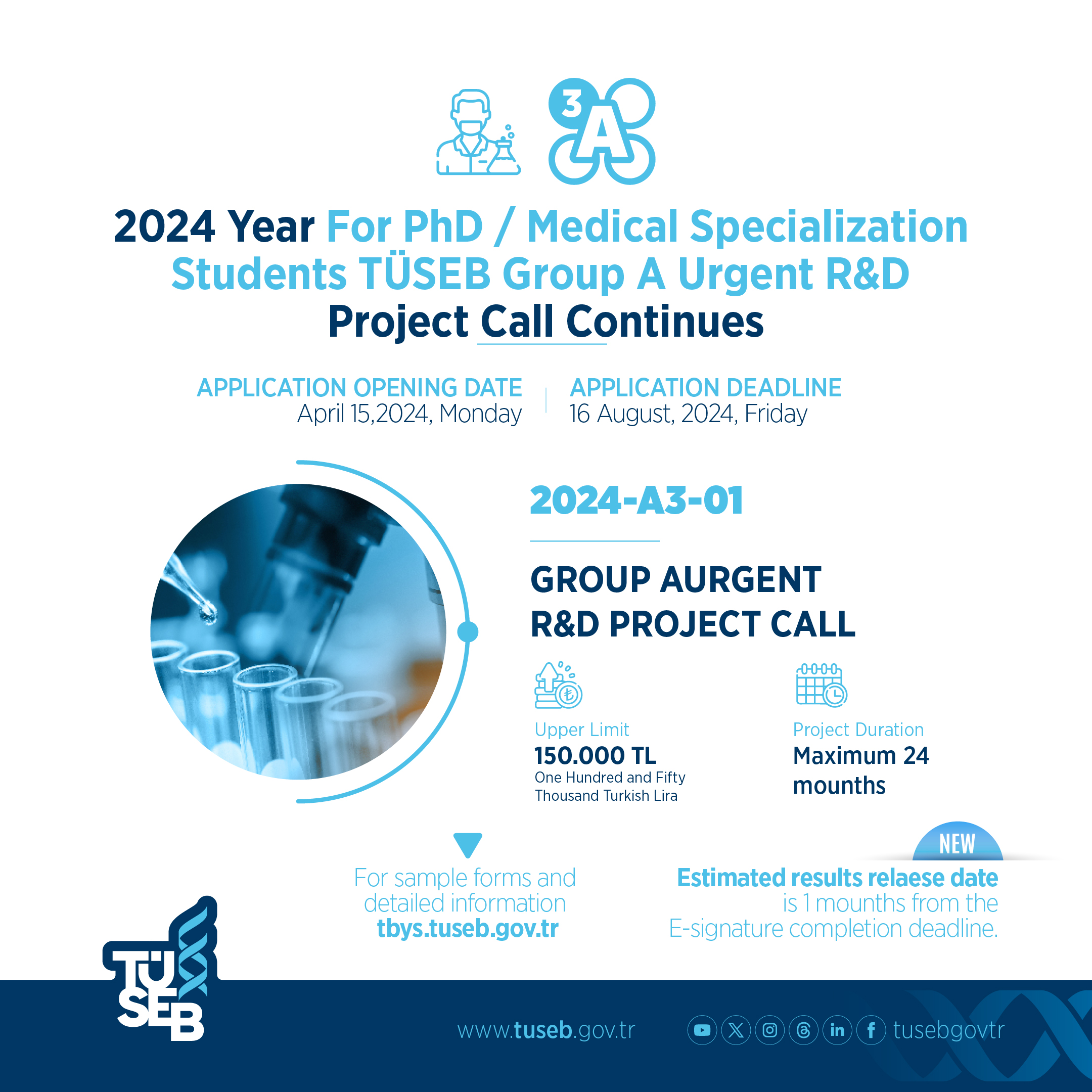 The 2024 TÜSEB Group A Emergency R&D project A3-01 calls opened for applications on April 15, 2024.