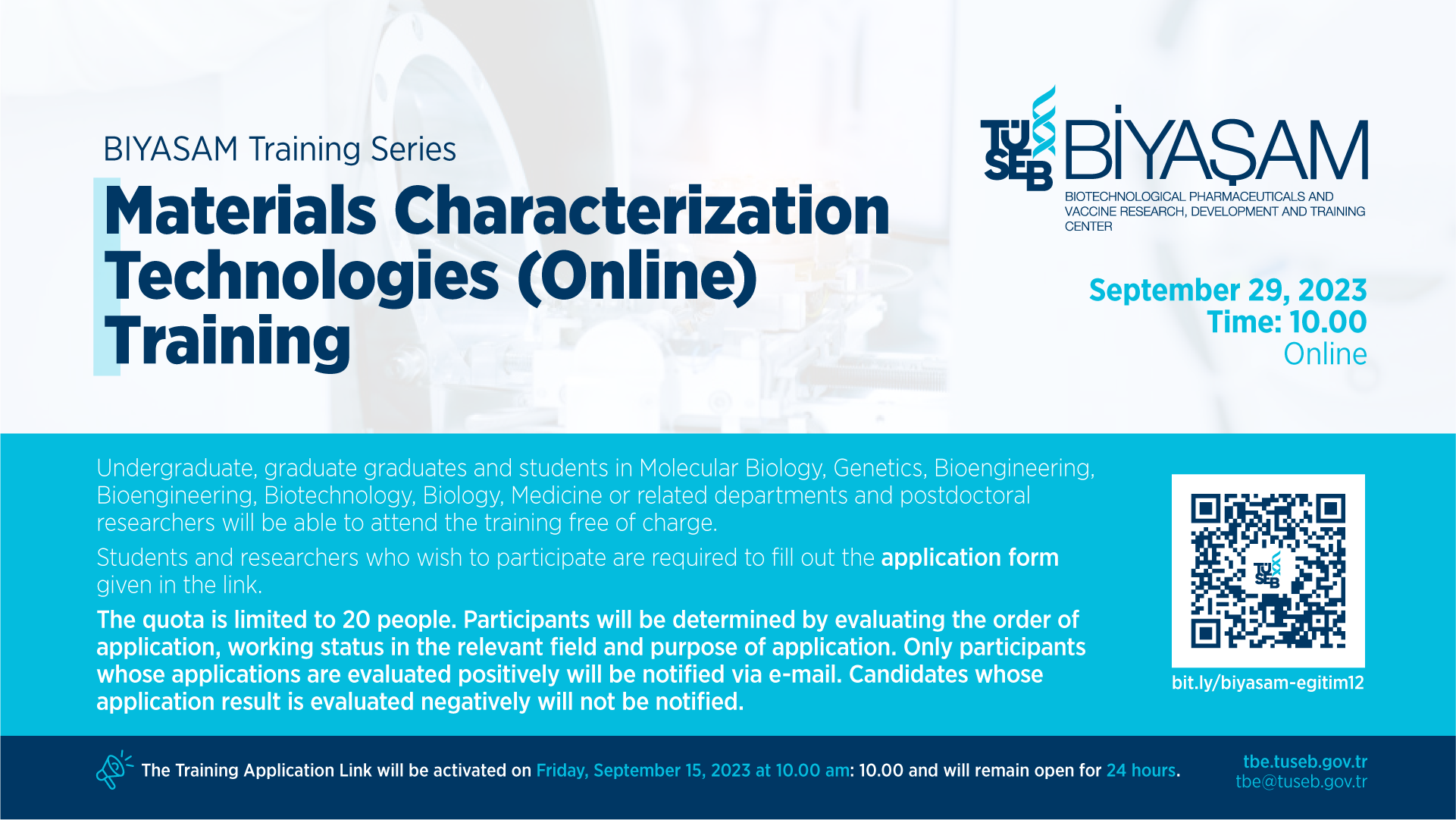 TÜSEB Turkey Biotechnology Institute will organize 'Material Characterization Technologies (Online) Training' within the scope of BİYAŞAM Training Series. The training will be held on September 29, 2023 via online platform. The training will start at 10:00 and will focus on basic topics such as the importance of developing technologies in determining the structure and properties of materials, the most commonly used devices for characterization processes, techniques frequently used to characterize materials, graphs and data interpretation techniques.