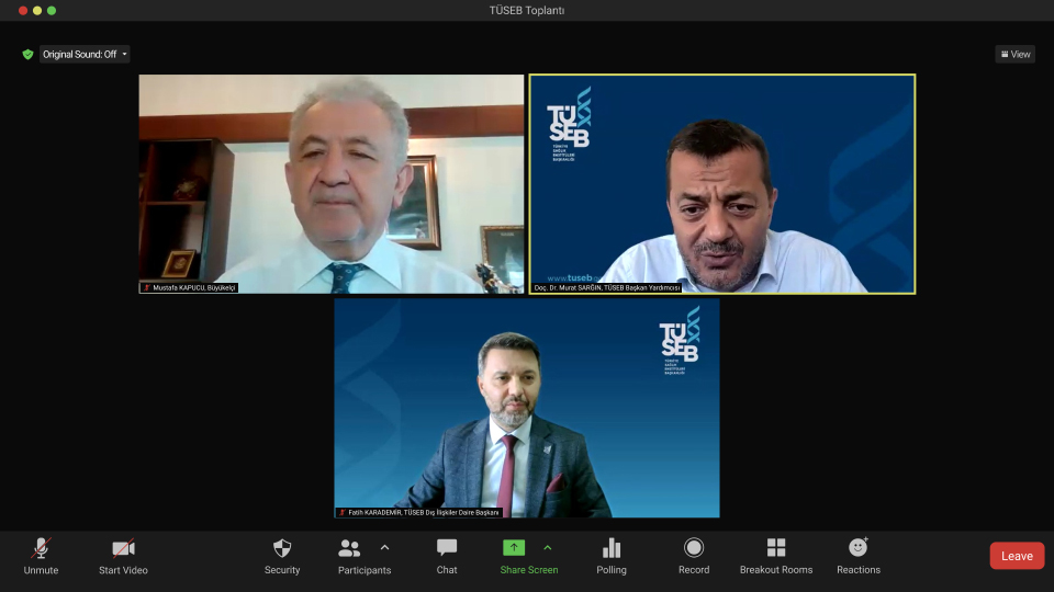 On August 29, 2025, an online meeting was held between Health Institutes of Türkiye (TÜSEB) and His Excellency Mustafa Kapucu, Ambassador of Türkiye to Astana, Kazakhstan. The meeting was attended by TÜSEB Vice President Assoc. Prof. Dr. Murat Sarğın and Head of Foreign Affairs Department Fatih Karademir. During the session, collaboration opportunities were evaluated across all institutes operating under TÜSEB, including, but not limited to, the importance of physician training in cancer treatments, establishing a joint center for artificial intelligence-based health projects, traditional and complementary medicine applications, development of biotechnological products, and applications in maternal, child, and adolescent health.