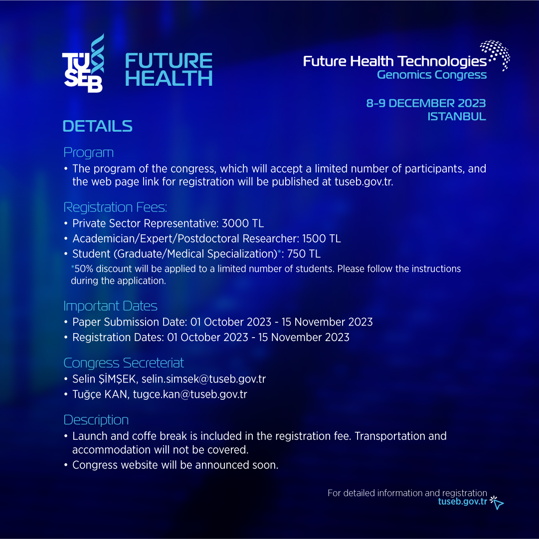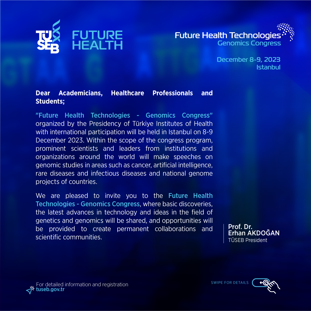 "Future Health Future Health Technologies - Genomics Congress" organized by the Health Institutes of Türkiye which international participation will be held in İstanbul on 8-9 December 2023. Within the scope of the congress, leading scientists from institutions and organizations around the world will make speeches on genomic studies in areas such as cancer, artificial intelligence, rare diseases and infectious diseases and national genome projects of countries.Details of the congress, where basic discoveries, the latest advances in technology and ideas in the field of genetics and genomics will be shared, and opportunities for permanent collaborations and scientific communities will be provided, will be published separately.