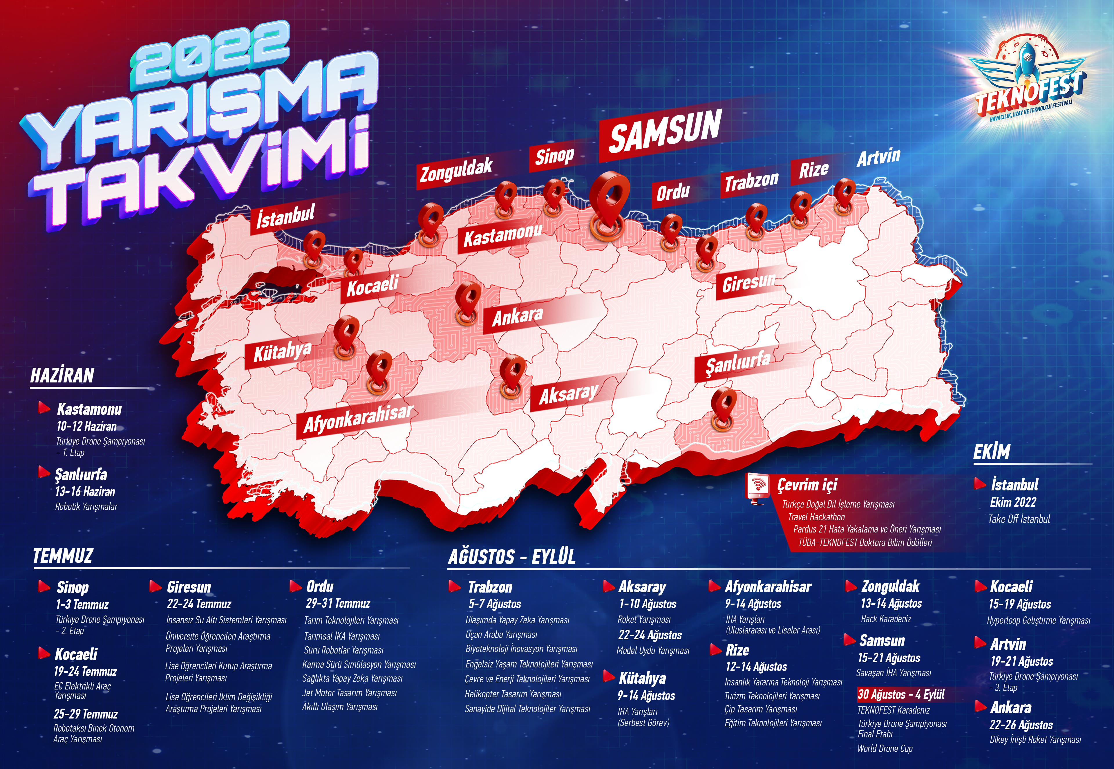 Turkey’s first and only Aerospace and Technology Festival – TEKNOFEST, which has been organized since 2018 in order to raise awareness on national manufacturing in technology with the National Technology Move in Turkey and to discover scientists and engineers of the future, will be held in Black Sea Region on August 30th – September 4th, 2022, the competitions will be held in different cities and on different dates.