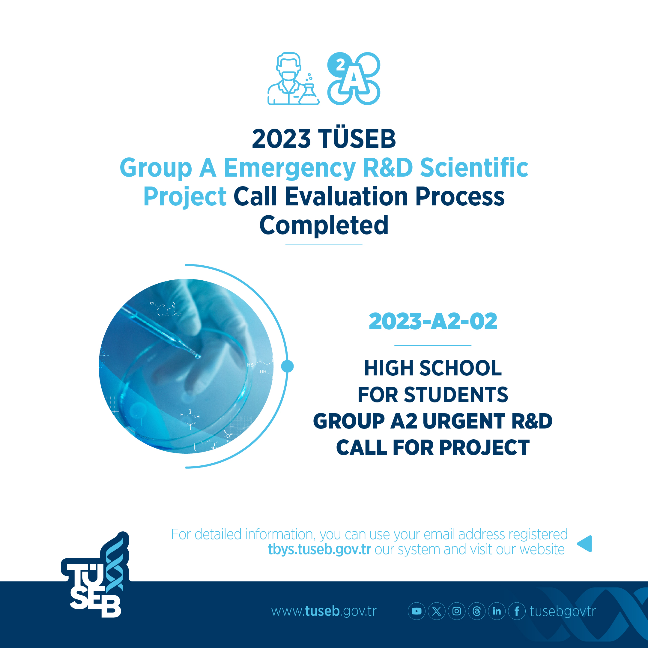 The scientific evaluation process of the projects submitted to the Project Management and Support Department for 2023 under the scope of the TÜSEB Group A Emergency R&D Project Support Program has been completed. For detailed information, you can utilize the email address registered in our system and visit our website tbys.tuseb.gov.tr