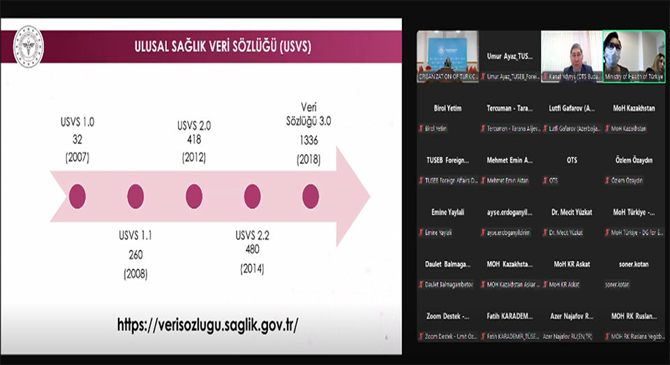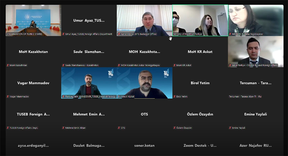 On March 4, 2025, the online meeting of the Health Data Dictionary of the Organization of Turkic States (OTS) was attended by representatives from Kazakhstan, Kyrgyzstan, Azerbaijan, Uzbekistan, as well as Esra MUŞ, Head of the Standardization and Accreditation Department of the General Directorate of Health Information Systems of the Ministry of Health of Türkiye, and Unit Supervisor Ceyhan Vardar, Fatih KARADEMİR, Head of Foreign Department at Health Institutes of Türkiye, Dr. Mecit YÜZKAT, Researcher at Türkiye Health Data Research and Artificial Intelligence Applications Institute, Dr. Ayşe ERDOĞAN YILDIRIM, Researcher, Dr. Mehmet Emin AKTAN, Researcher, Dr. Soner KOTAN, R&D Specialist, Dr. Emine YAYLALI, Researcher, Dr. Birol YETİM, Researcher at Türkiye Health Policies Institute, and Associate Professor Dr. Özlem ÖZAYDIN, R&D Specialist representing Türkiye Maternal, Child, and Adolescent Health Institute.