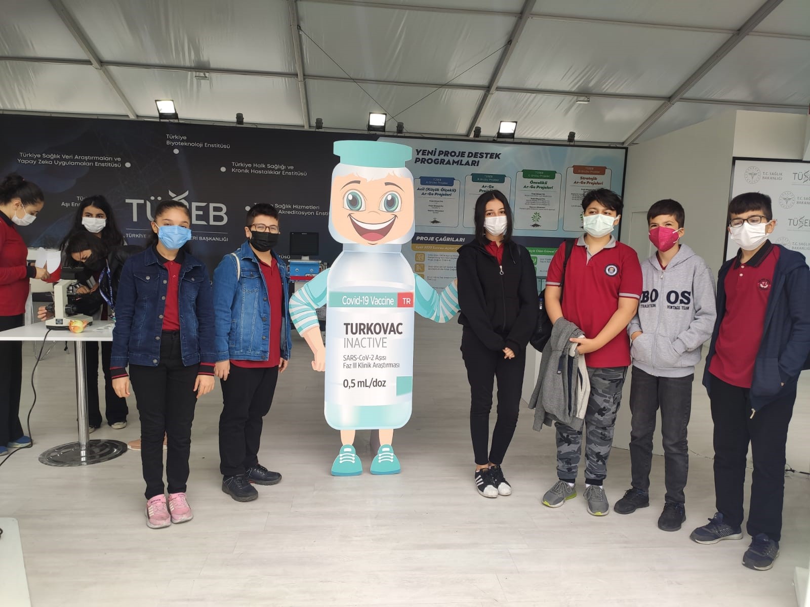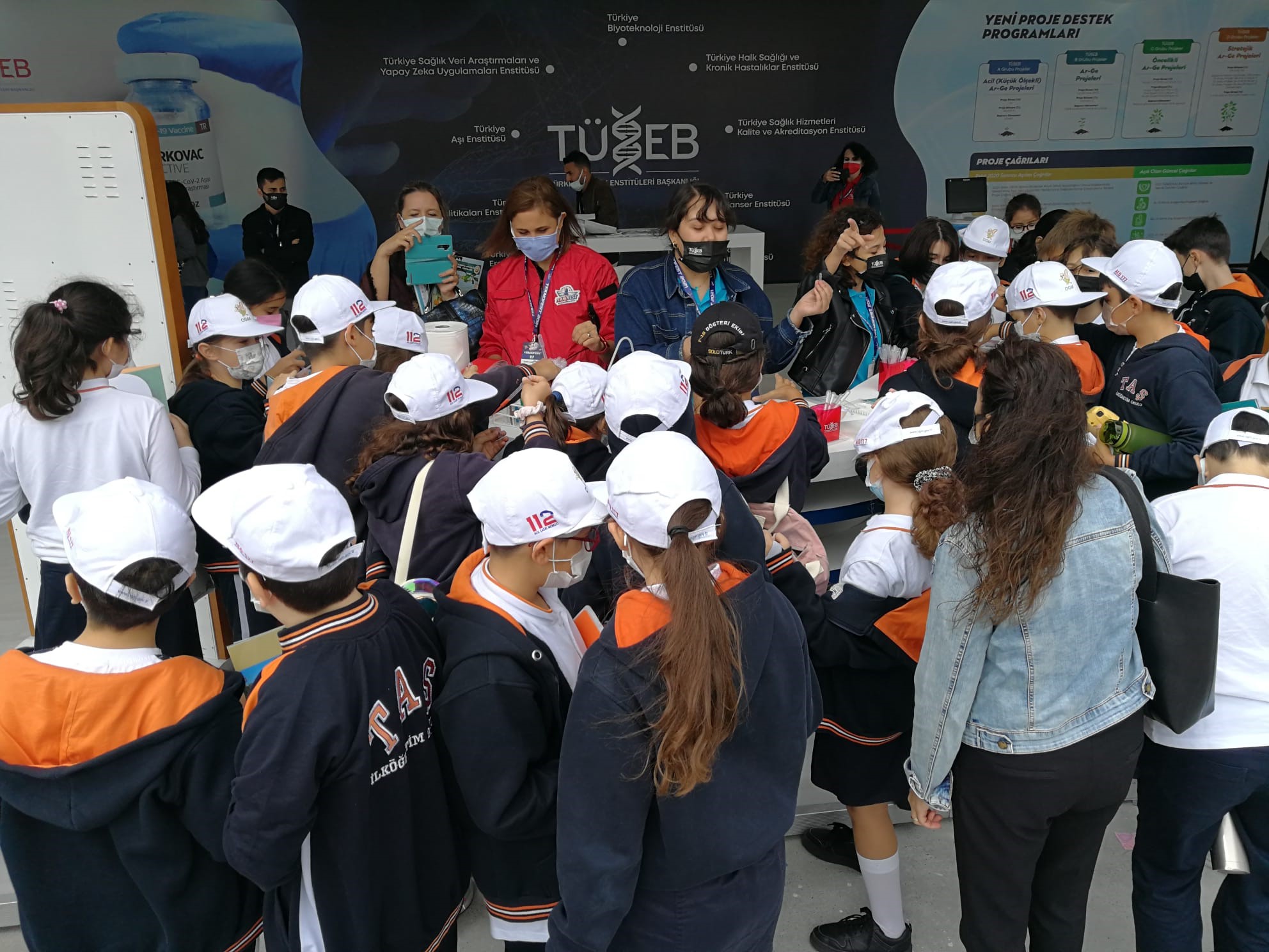 The visitors of TUSEB booth investigate the first domestic COVID-19 vaccine TURKOVAC, the first top-ranking ventilator BIYOVENT and the domestic COVID-19 diagnosis kit DIAKIT developed by TUSEB.