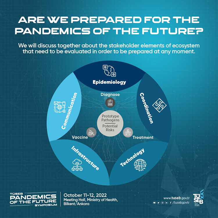 With the experience gained during the COVID-19 pandemic process, bringing together all the stakeholders of the ecosystem in order to determine the roadmap of our country for future pandemics, to make comprehensive evaluations, to ensure coordination and to determine strategies will constitute a guarantee for the creation of solutions to the problems that our country will face in the future. In this context, it is of great importance to reveal the studies and developments in the fields of epidemiology, coordination, infrastructure, technology, communication; transformations in the fields of diagnose, treatment and vaccine studies; prototype pathogens and potential risks. Within the scope of the said situation, “TÜSEB PANDEMICS OF THE FUTURE SYMPOSIUM” will be held in the meeting hall of Ministry of Health, Bilkent, Ankara on October 11-12, 2022, by TÜSEB, which is the leading institution of health ecosystem, in order to made contributions into the common future of humanity. In the symposium, which will start with the participation and opening speech of Minister of Health Dr. Fahrettin Koca, we will evaluate our roadmap for the pandemics of the future thanks to the experiences we have gained during COVID-19 pandemic.