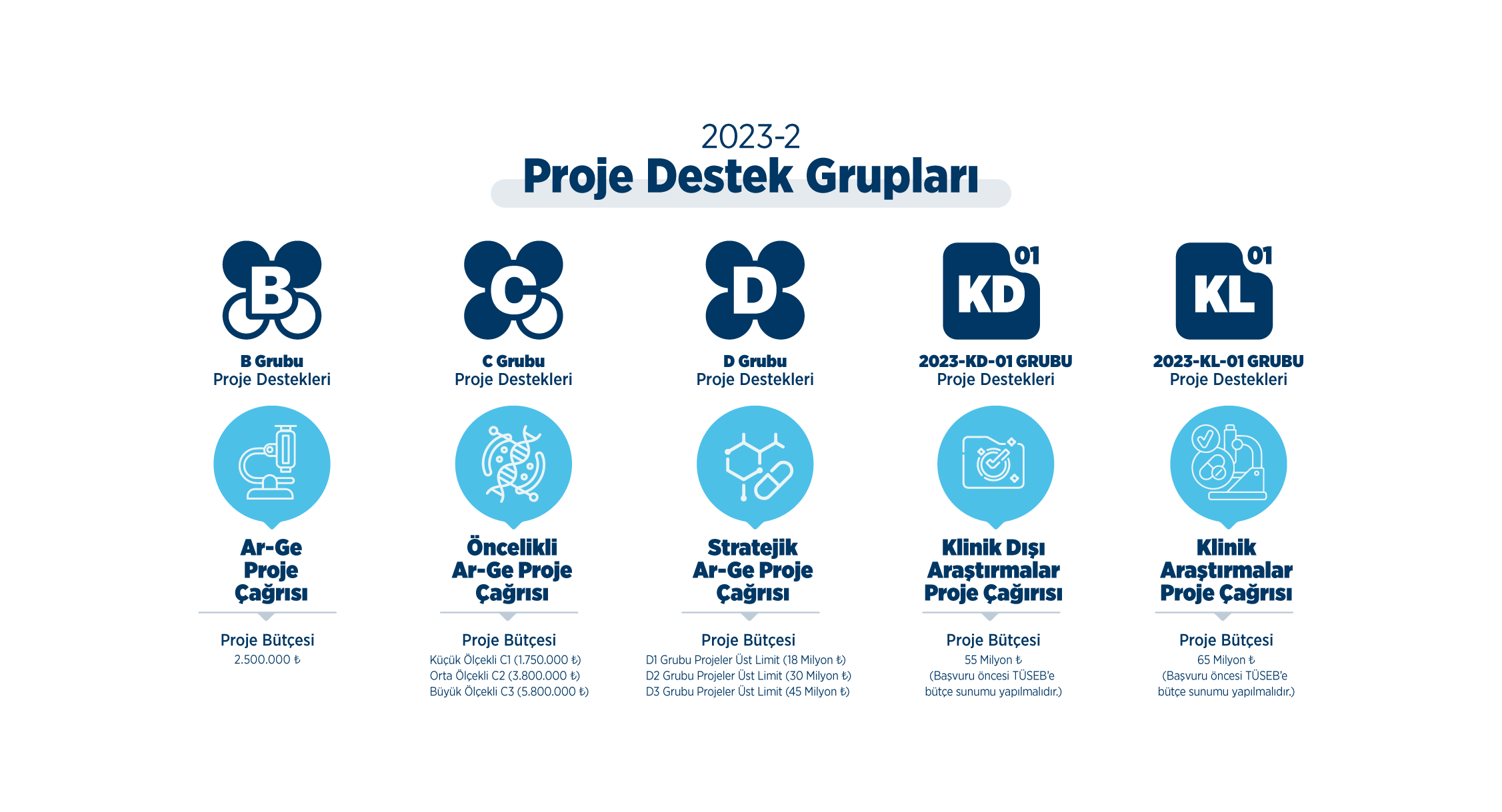 D grubu desteklerin limitleri ise klinik öncesi ve klinik araştırmalar olmak üzere 65 milyon TL'ye çıkartılmıştır.