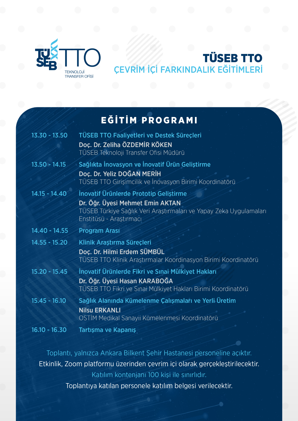 Eğitimler, TÜSEB Teknoloji Transfer Ofisi’nin faaliyetleri ve destek süreçlerinin yanı sıra; fikri haklar, girişimcilik, klinik araştırmalar, yerli üretim, inovasyon ve prototip geliştirme gibi sağlık ve teknoloji kesişimindeki başlıklara odaklanıyor.