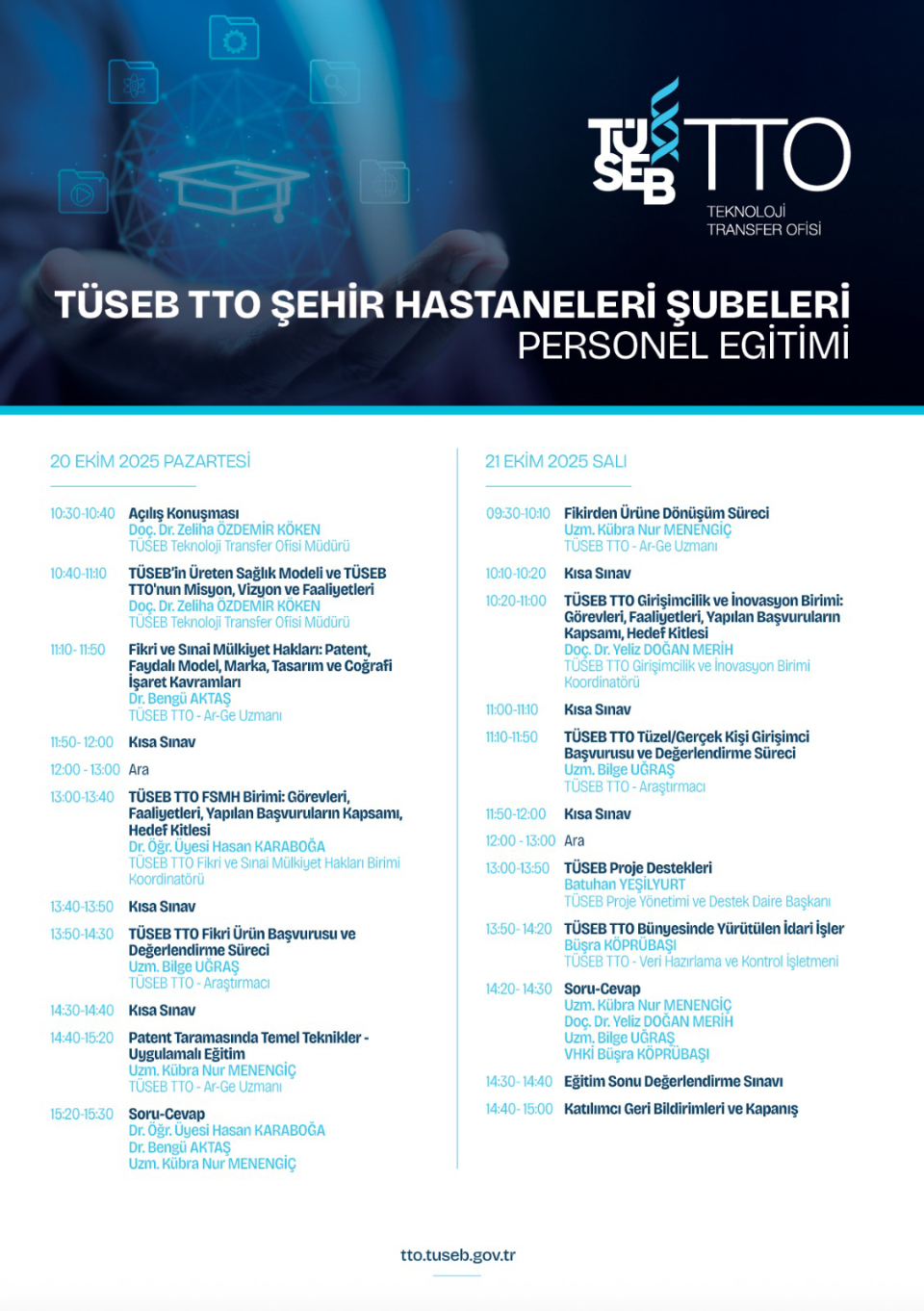 TÜSEB Teknoloji Transfer Ofisi (TTO) tarafından, Şehir Hastanelerinde açılan TTO şubelerinde görevlendirilen personele yönelik düzenlenen eğitim programı, 20-21 Ekim 2025 tarihlerinde çevrim içi olarak gerçekleştirildi.